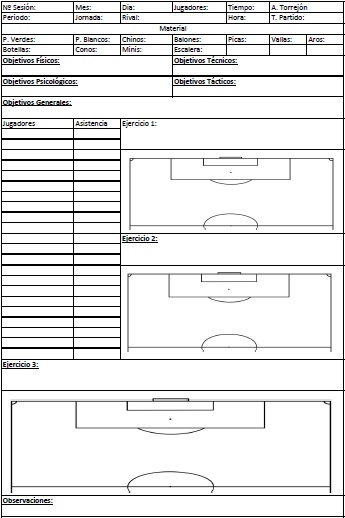 A partir de aquí ya empezamos con lo que será la sesión en sí. En la parte izquierda tendremos los nombres de los jugadores de nuestra plantilla y al lado si han asistido o no al entrenamiento y en caso de no asistir podemos poner el motivo para tenerlo en cuenta en caso de que puedan o no recuperar la sesión con otro equipo del club. En la parte derecha y abajo tenemos 3 campos de fútbol con su pequeña descripción donde explicar con palabras y mediante dibujos los ejercicios de la sesión. y por último una zona de observaciones donde anotar errores y comentarios que nos hayan surgido durante la sesión y que vamos a tener que tener en cuenta durante el futuro.